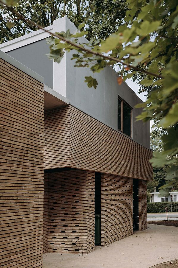 Ook in het terras wordt een uitsparing voorzien om de bestaande bomen te accentueren en te integreren in het hele ontwerp. Het pad naar de voordeur werd in dezelfde kleikinker als de gevelsteen aangelegd. Warme, tactiele materialen staan centraal op dit bosrijk perceel.